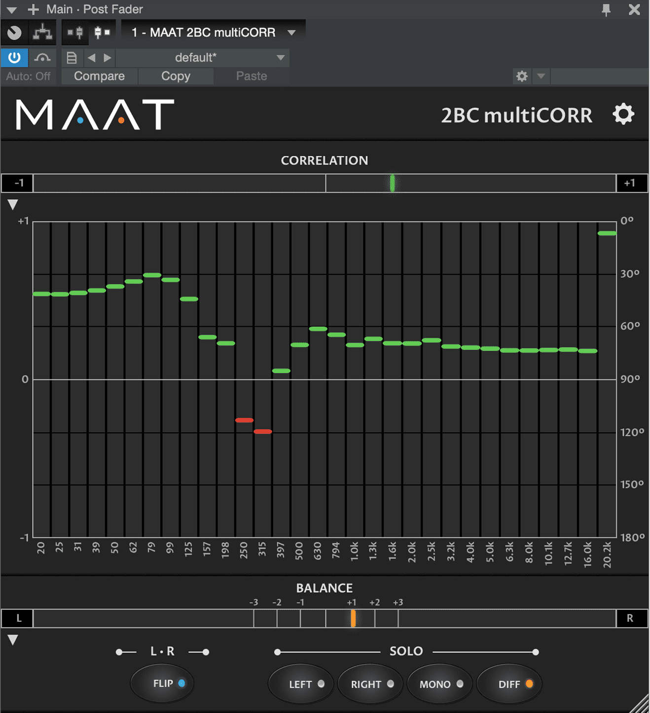 2BC multiCORR isn’t just multiband correlation. It also includes a left/right balance meter, a broadband left/right correlation meter, plus five monitor controls allowing you to focus on any issues you may come across.