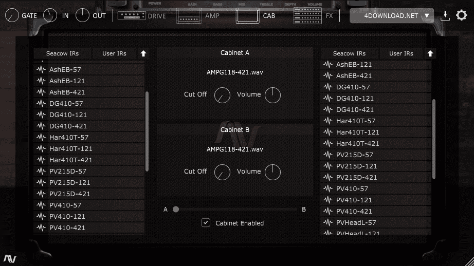Mix and match from the included 33 Bass Cab IRs or your own collection. Use the Cutoff knob to blend the IR with the bass from the Amp/DI blend.