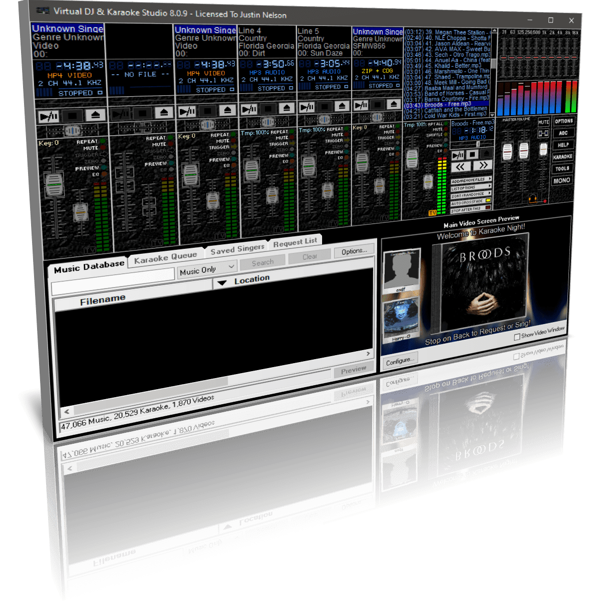 Virtual DJ & Karaoke Studio is not like all of the other DJ programs out there. While other programs limit you to two players with a Cross-Fader, Virtual DJ & Karaoke Studio provides you with an entire studio. Video Playback allows you to mix Video and Music files (as well as Karaoke) seamlessly. You can even specify a Video as your background - CDG lyrics will appear over top of a looping video or even an attached webcam! The Background (whether it's a Video, Camera, or a still image) darkens as the CDG lyrics come up.