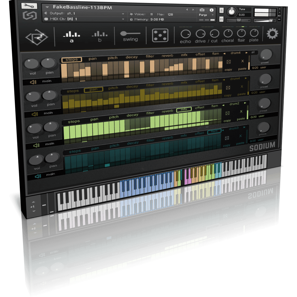 SODIUM is a creative drum and beatsequencer for KONTAKT 6.2.2. It features 200 inspiring contemporary factory kits. It also comes with hundreds of included drum sounds to get you started. (You can also import your own WAV samples via drag and drop). SODIUM features four drum sequencers - each one has four distinct drum sounds and 32 steps (divided into two key-switchable patterns). Each sequencer gives you control over velocity, volume and panning, pitch, decay, (lowcut) filter, reverb, multi-fx, sample offset and flam.