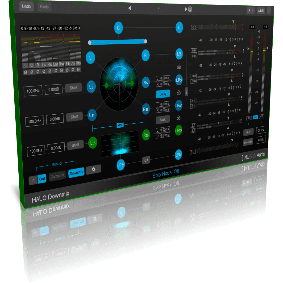 Halo Downmix’s highly customisable interface includes both 7.1 & 5.1 modes, and advanced & compact modes, with quick-select ‘in-place’ monitoring of stereo and surround signals, as well as quick linked solo and mute functions at every stage, and clear visualisation of surround energy distribution.