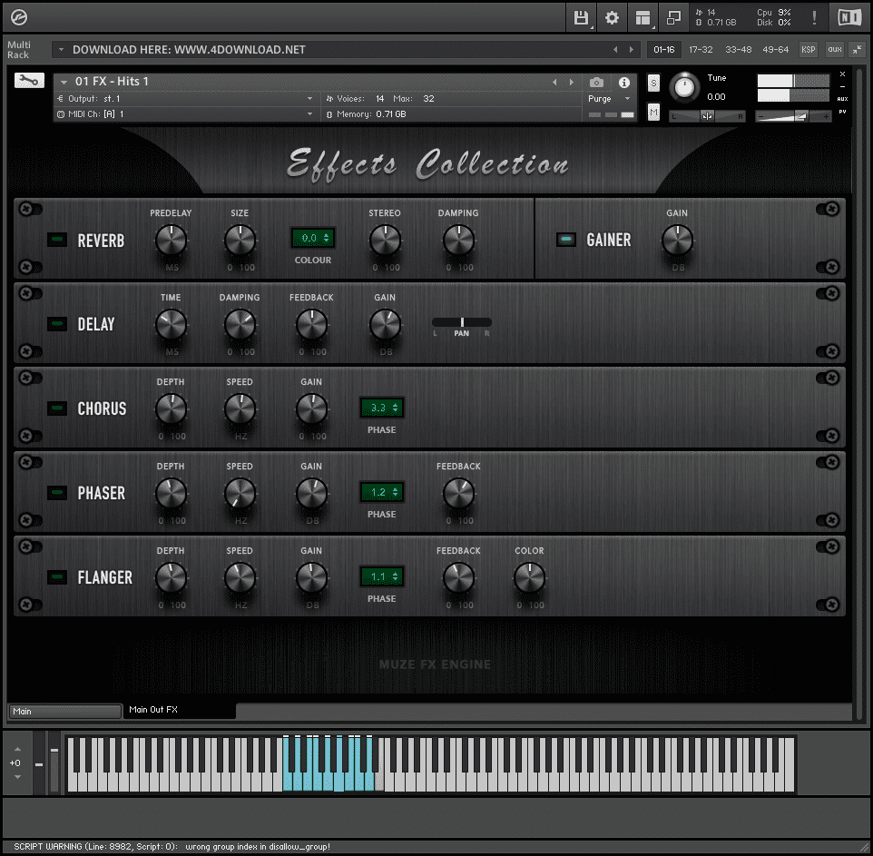 Instrument Main Effects: delay, chorus algorithmic reverb, phaser, gainer and flanger.