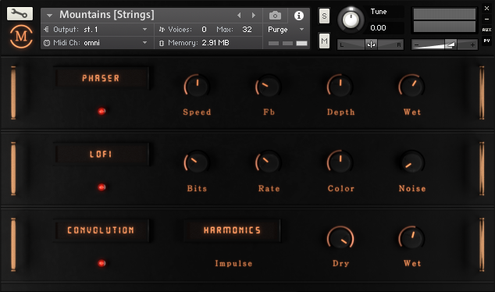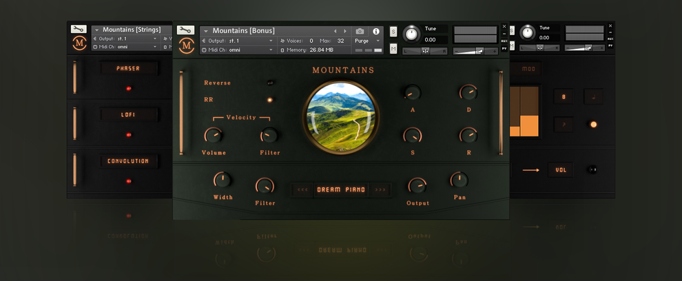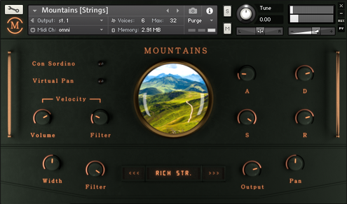 The new interface gives you now full ADSR control and has a master section where you can set Stereo width, Filter (LP) cutoff, Output gain and Panorama position. Each of the three patches has also some individual controls like a con sordino button for the strings or tape saturation settings for the pads. In addition to that does each of the three patches have individual controls like reverse function, con sordino button etc. Look up the manual for more information.