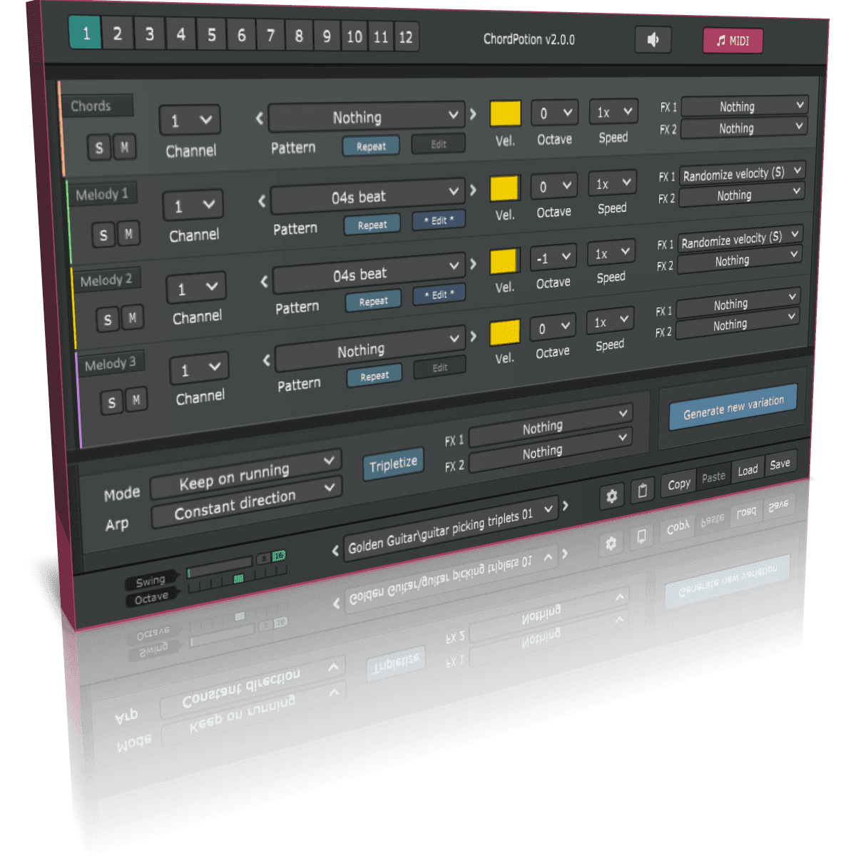 The ChordPotion MIDI effect plug-in (VST + AU) is your quickest way to create powerful and impressive harmonic phrases within seconds. Improve your songs and arrangements with authentic and professional patterns that react to your chords. You can mix and combine different playing styles with each other to create your own unique recipes. Do you already have some nice chords for your song? Great! Because this is all you need to create impressive, captivating melodies and phrases from here.