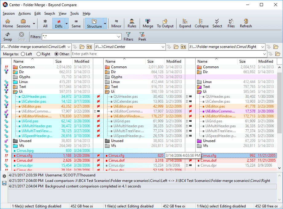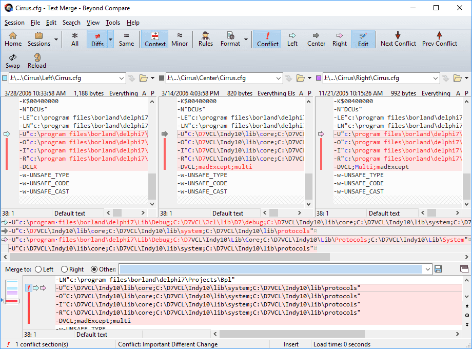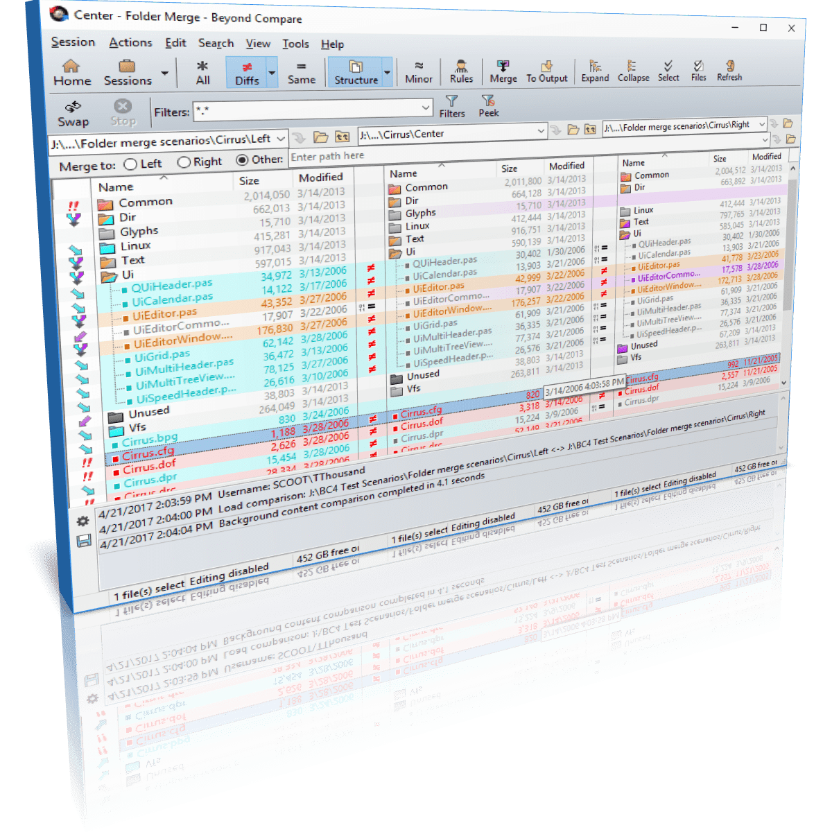 Beyond Compare's merge view allows you to combine changes from two versions of a file or folder into a single output. Its intelligent approach allows you to quickly accept most changes while carefully examining conflicts. Color coding and section highlighting allow you to accept, reject, or combine changes, simply and easily. When merging files you can change any line in the output with the built-in syntax-highlighting editor. By using Beyond Compare's powerful file type support and ability to favor changes from one file, you can trivially accept many changes without even seeing them.