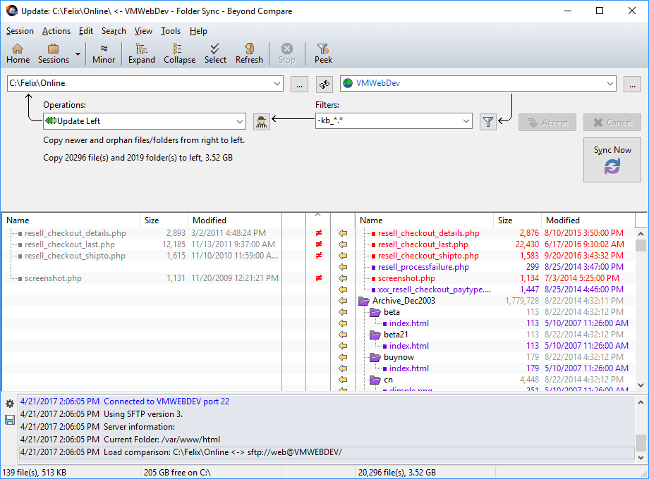 Beyond Compare's intuitive Folder Sync interface lets you reconcile differences in your data automatically. You can efficiently update your laptop, backup your computer, or manage your website, and Beyond Compare will handle all the details. You can copy to and from disks, FTP servers, and zip files, all using the same interface. Anything you don't want affected can be easily filtered out, and all of the powerful comparison techniques are available, making the backup as fast or robust as you need.