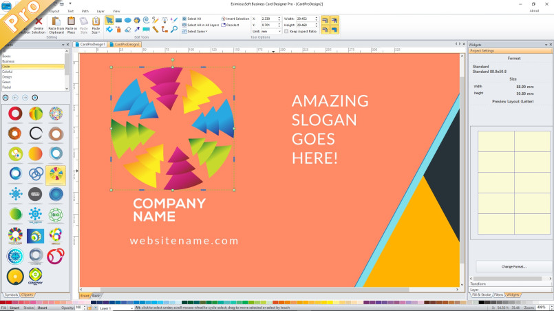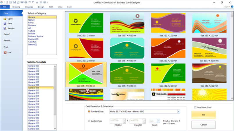 It is powerful but easy software for creating professional looking business cards. With which, you can design your own cards as you want. Select from pre-designed business card templates and customize with your texts and symbols to build attractive cards. That happens so easily and quickly! EximiousSoft Business Card Designer is also professional quality printing software. It supports to export cards to image files with high quality which are printed for print shop. Also it enables to print spectacular business cards on your own printer, on card stocks from Avery, Sigel, Herma, Formtec, DECAdry etc. Business Card Designer provides huge amount of background images, logos, shapes, symbols, gradient styles. Which make your art work is so simple.