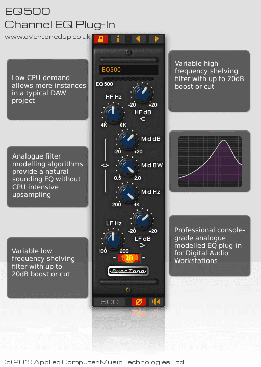A natural sounding, versatile, analogue filter modelled EQ, economical with CPU and system resources. Digital EQ no longer has to sound digital. The EQ500 plug-in emulates all the desirable qualities of a professional analogue channel equalizer, while the elegantly simple design makes adding texture and colour - or taming problem frequencies - both intuitive and instinctive.