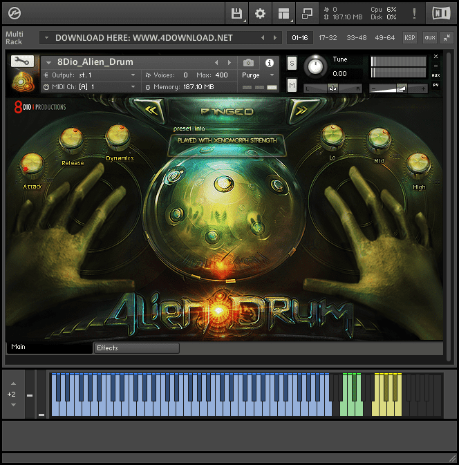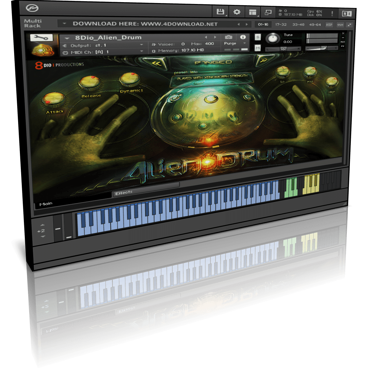 The Alien Drum is incredible easy to use and lends itself very well to alternative instrument design. We created a variety of morphed presets that mixes the Alien Drum with other instruments from the custom 8Dio sample catalogue (ex. modified piano, plucked piano, tonal percussion, custom string instruments, synths etc). We also created a 3D animated interface (be sure to check the video) – and you have front-face controls, including Attack, Release, Dynamics and a nice 3-Band EQ.