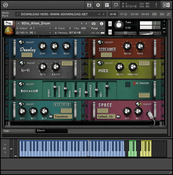 The New Alien Drum also comes with a gorgeous set of built-in effects. We added Delay, Amp/Screamer Emulations, Lo-Fi (Bit-Crusher), Fuzz, Rotator and two different types of convolution reverbs. The first convolution reverb contains a variety of custom natural space we’ve recorded over time. This includes some of our favorite recording environments in churches and cathedrals. The second convolution reverb contains a large selection of more experimental convolution shots – great if you want to sound design your Alien Drums.