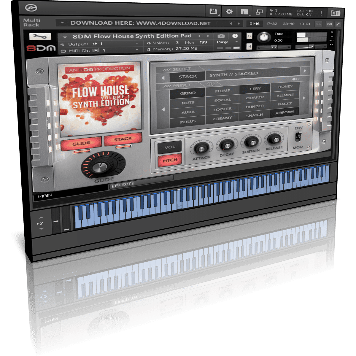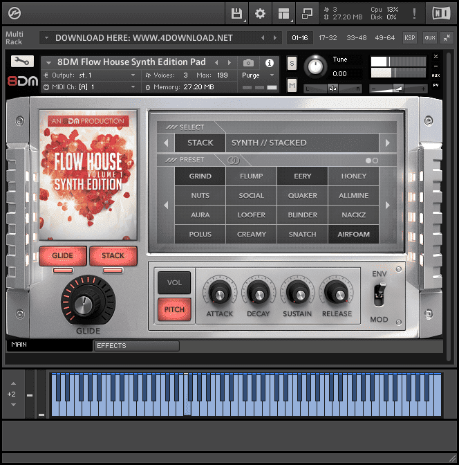 Stacking is a new way of browsing synths. In essence it allows you to stack multiple patches in real-time. We designed the Flow House Synth Edition in such a way that all patches are loaded into RAM, so there is no load time. The stacking function lets you merge as many patches as you want together to find that specific texture that just dials straight into your mix. So in essence you can browse a lot faster then conventional synths and put a personal stamp to the sound by combining multiple patches.