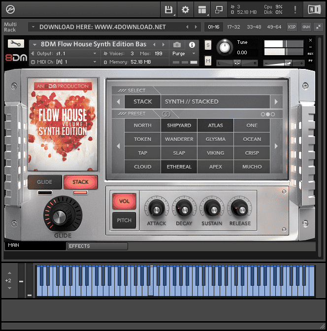 Flow House Synths contains an intuitive browsing environment with all patches loaded into RAM. This allows you to quickly glance through all patches with a single mouse click and no load time. You also have instant access to features like portamento (glide), stacking, ADSR, volume and pitch modulation – all from the front interface. The idea is to make everything easy to access from the front page, but also provide full control over the synth for anyone who wants to dive deeper.