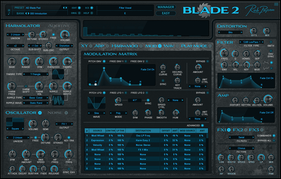 The original BLADE synthesizer released in 2012 had a unique concept in controlling the waveform harmonics (Harmolator) by using an XY pad. On top of that, the XY pad movement could also be recorded, edited, and played back tempo-based. This concept of BLADE meant that you could generate some very different sounds, compared to regular subtractive and even additive synthesizers.