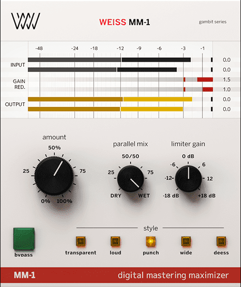 Based on the legendary Weiss DS1-MK3, the centerpiece of mastering studios the world over (and also now available as a Softube plug-in), we’re delighted to offer the future of fast and professional mix maximizing the MM-1 Mastering Maximizer. Featuring the very same algorithms as the original digital hardware unit, the MM-1 offers five flavours of limiting; transparent, loud, punch, wide, and deess; intelligently progressing as the ‘amount’ knob turns, and blendable with the mix control, to give you precisely the right amount of power over the feel of your masters.