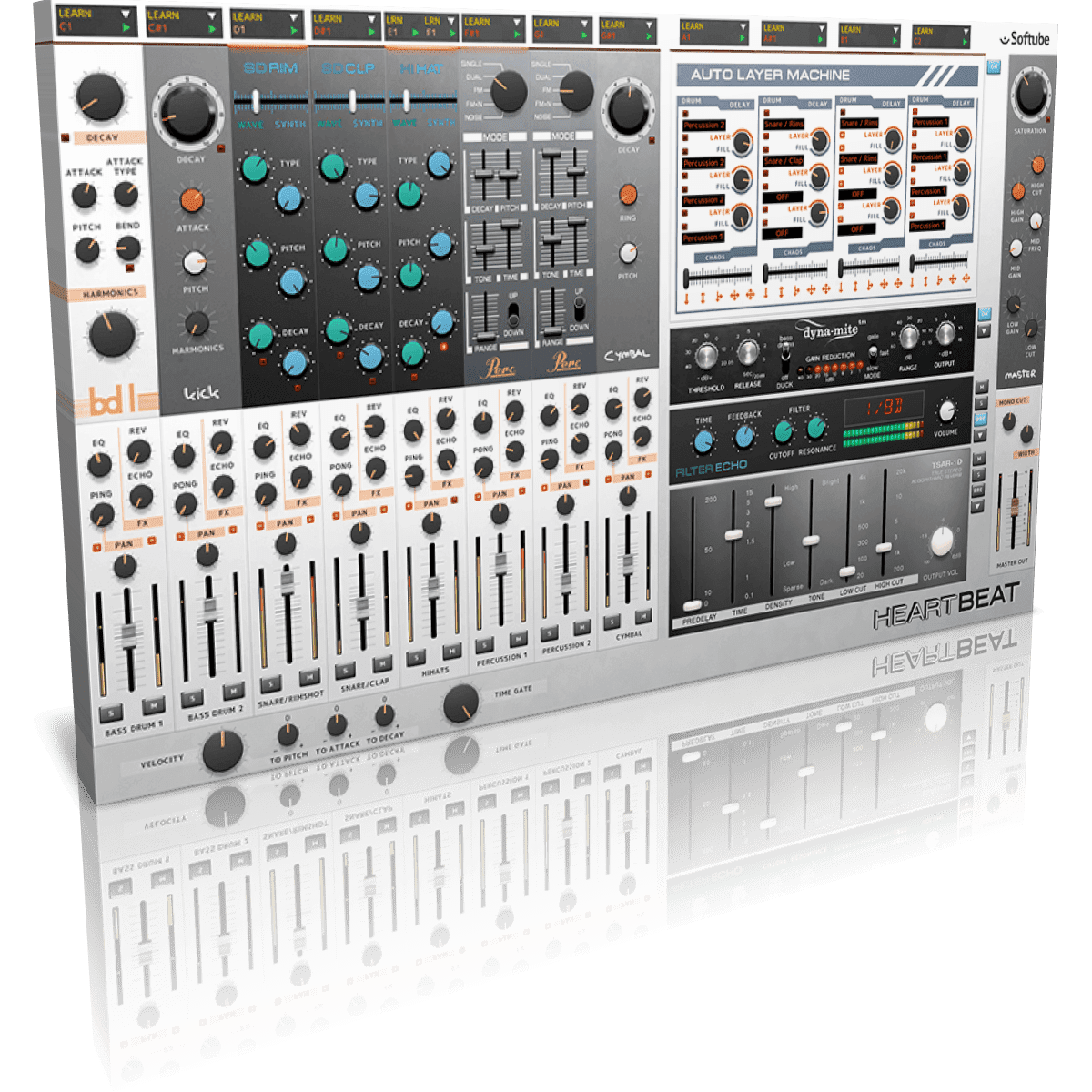 While Heartbeat draws inspiration from the best analog drum synths from the 1980s, it does not emulate any existing drum machine. The sound mostly originates from Softube's own modeled analog synthesis, which has been augmented with carefully selected waveforms.