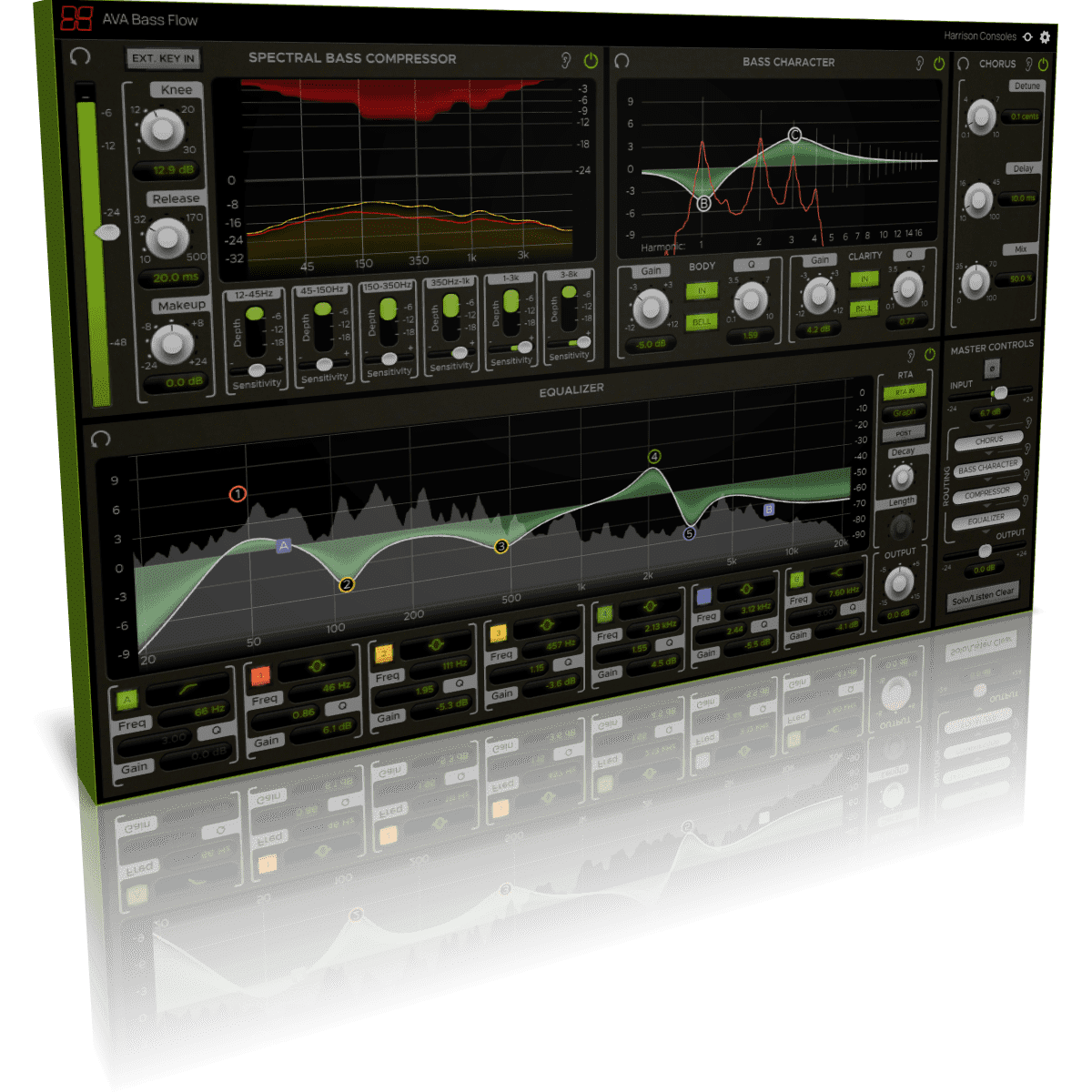 AVA Bass Flow is a channel strip plug-in designed for mixing bass. It contains 4 routable processing elements and a master section with input, output, and routing controls.