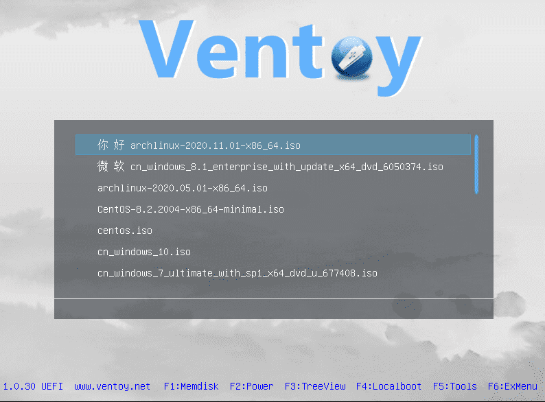 Ventoy is an open source tool to create bootable USB drive for ISO/WIM/IMG/VHD(x)/EFI files. With ventoy, you don't need to format the disk over and over, you just need to copy the ISO/WIM/IMG/VHD(x)/EFI files to the USB drive and boot them directly. You can copy many files at a time and ventoy will give you a boot menu to select them. x86 Legacy BIOS, IA32 UEFI, x86_64 UEFI and ARM64 UEFI are supported in the same way. Most type of OS supported (Windows/WinPE/Linux/Unix/VMware/Xen...)