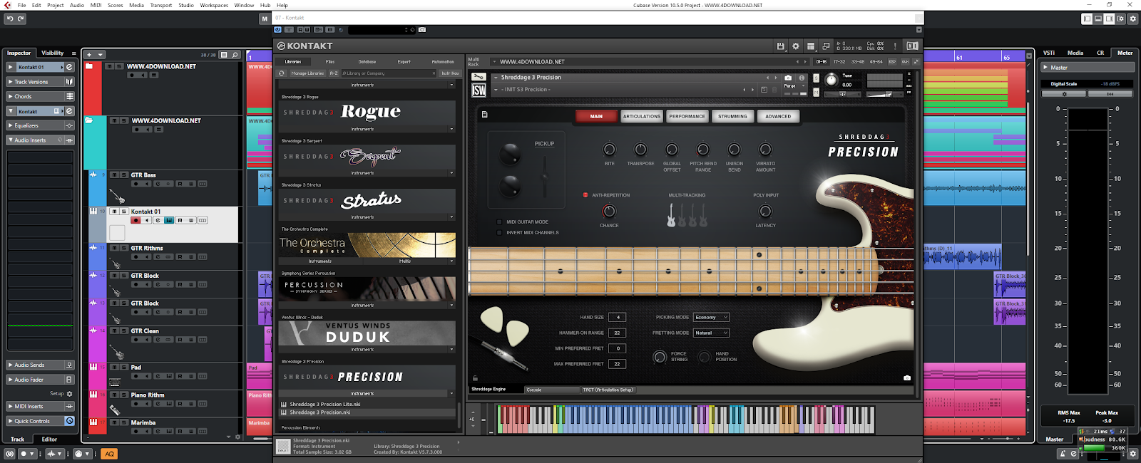 Shreddage 3 Precision was created to be the ultimate, versatile virtual bass. capable of playing in any genre, with all the techniques a real bassist uses. We spent months planning the perfect instrument and recording setup: bassist Tony Dickinson (Trans-Siberian Orchestra) performed all the samples using a high-end, American 5-string p-bass with flatwound strings for a beautiful, detailed sound. An all-analog UA|610 DI was used to further enhance the warmth and fullness of every note.