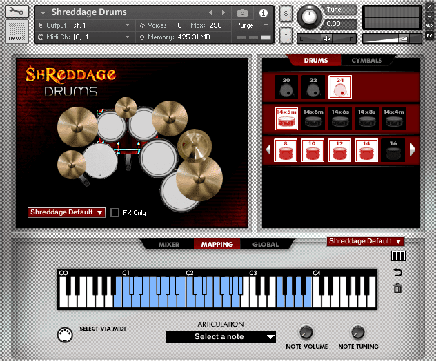 Pictured above is the Mapping tab which allows for flexible mapping of ANY drum or articulation to most any key. Mix and match drums and articulations from different kits, use our mapping presets, or create your own from scratch - it's incredibly easy to use. You can also map via MIDI learn, and adjust the volume and tuning for individual notes (even if those notes have the same drum/articulation mapped).