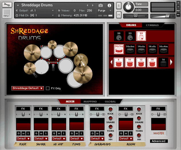 Shreddage Drums features an extremely powerful KONTAKT engine allowing for total control over drum kit design, mixing, routing, effects, and tweaks. In the image above, note the bus mixer along the bottom which gives flexible control over the volume, panning/width, and output routing of each microphone position. You can also tweak the overhead/room send to each mic which is very useful if you want a tight, focused kick or snare, but wide/roomy hihats and toms... or any other combination.