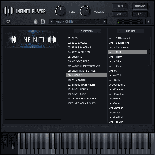 The Chord Section allows you to play any major, minor or diminished chord type. Music theory can some times be a challenge so we added controls to add a 7th, 9th or 11th to your chord structure. Infiniti Player has an advanced arpeggiator. With the first ever 3x up, up down & down up arp types. The library rack allows you to browse between & organize expansion packs. What makes Infiniti also stand out from the rest is its 3D animation library system. Each sound library contains a unique animation clip. So there is always something visually moving or lighting up when notes are being triggered. 500+ presets + expansion packs….. gives users an infinite amount of sound possibilities.