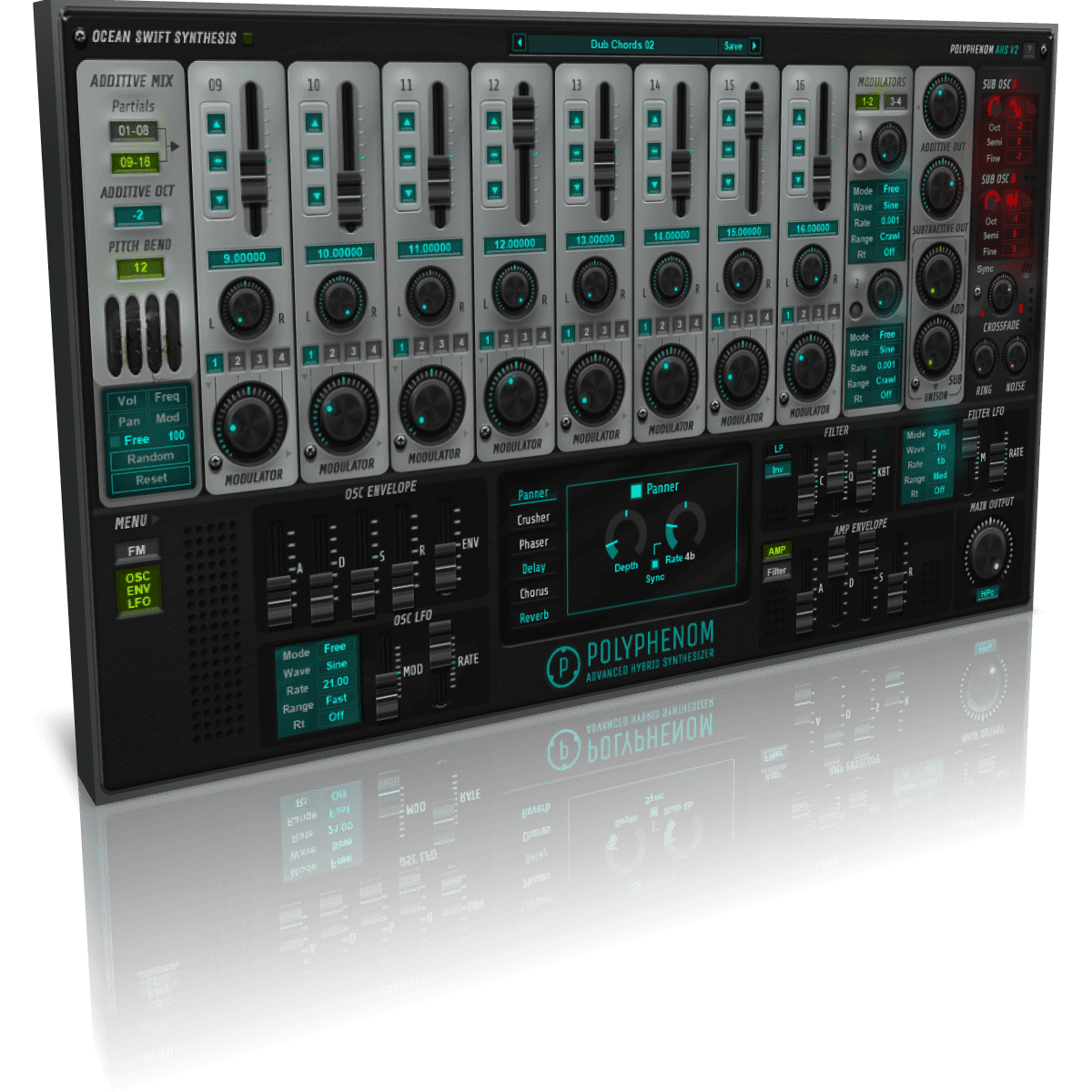 - Extensive set of built in effects that include: Panner, Crushe r, Phaser, Delay, Chorus and Reverb.