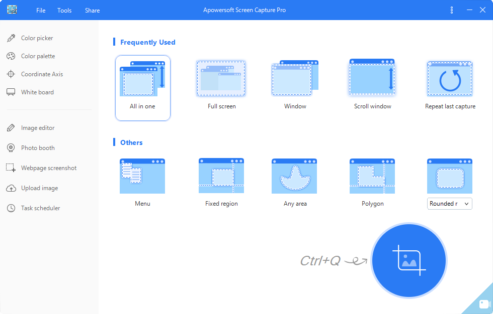 Quick access to all necessary tools is done using the edit bars. Apowersoft Screen Capture Pro has functions for sharing screenshots directly to social networks. There is also integration with the cloud, access to which takes place without the need to register.