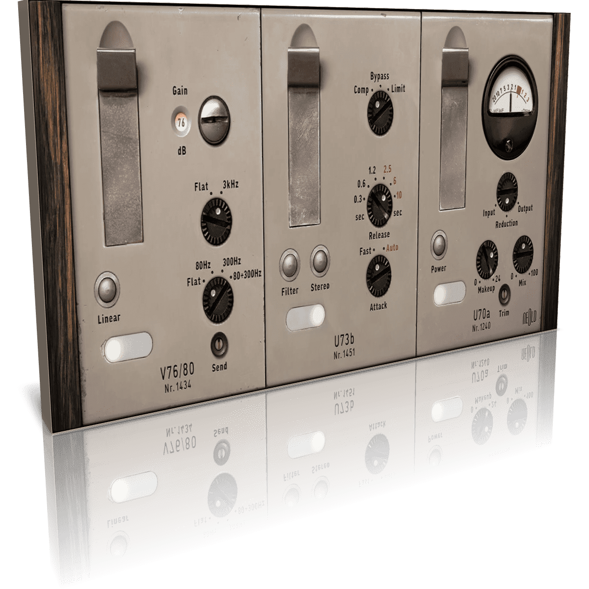 Simply running signal through these devices without moving a single knob can bring new life and dimension to just about any signal. But the V76 isn’t the only powerhouse of a tonal shaper from this family of modules. The U73 compressor/limiter builds on this tone, adding exceptionally smooth-sounding “variable mu” dynamic control that earned this tool the nickname of the “The German Fairchild.”