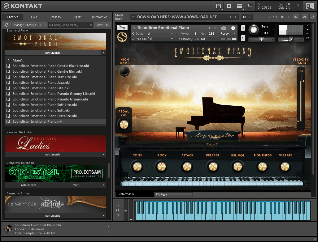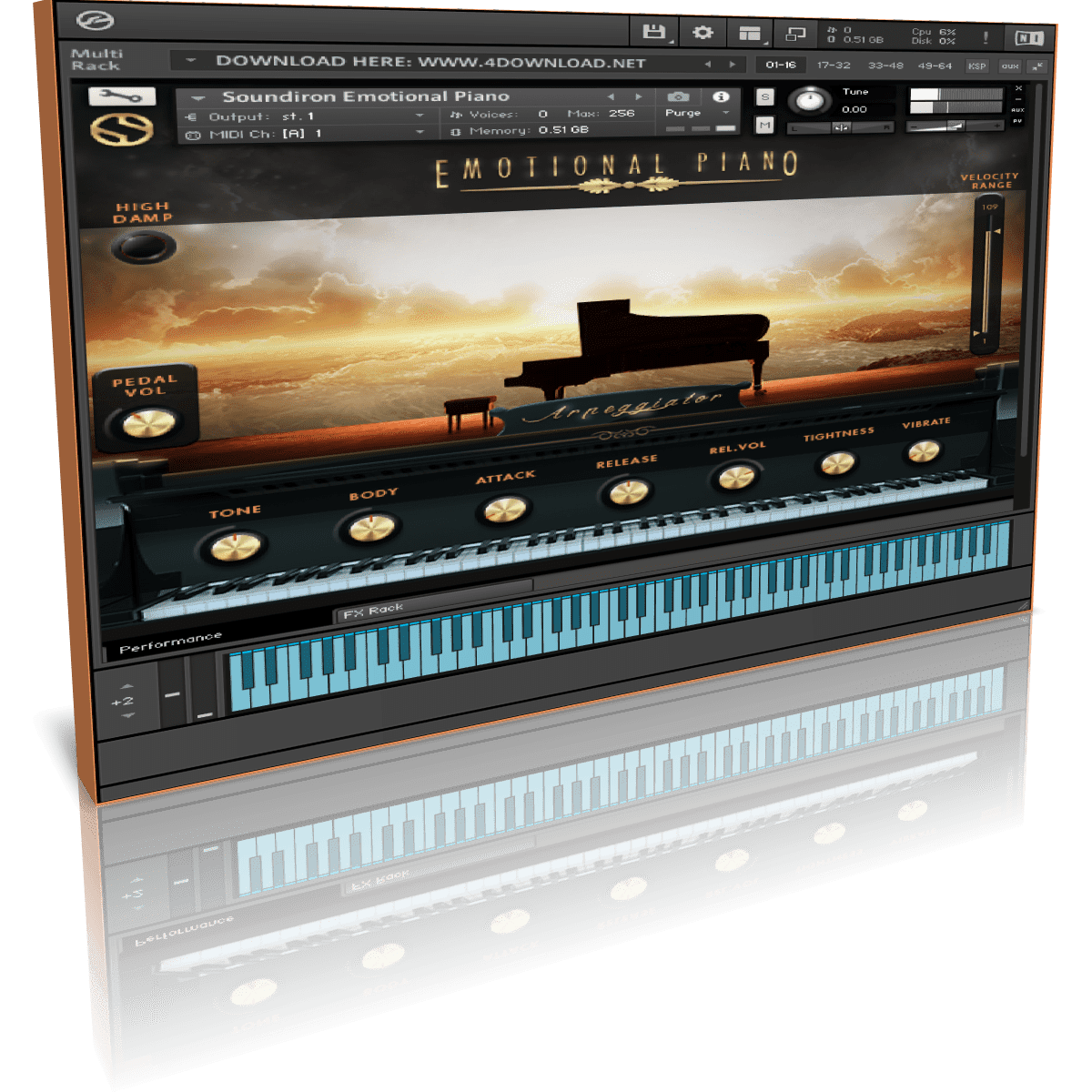 Emotional Piano is a legendary virtual grand piano designed for professional soundtrack scoring, song-writing and symphonic orchestration. We carefully selected this particular walnut-bodied Kawai grand piano for it’s soft, luminous warmth and rich, resonant tone. It's the perfect paintbrush for lush and emotive arrangements. Emotional Piano is also equipped with a huge selection of uniquely sound-designed custom presets and effects patches to give you an extraordinary range of sonic flavors and creative tools.
