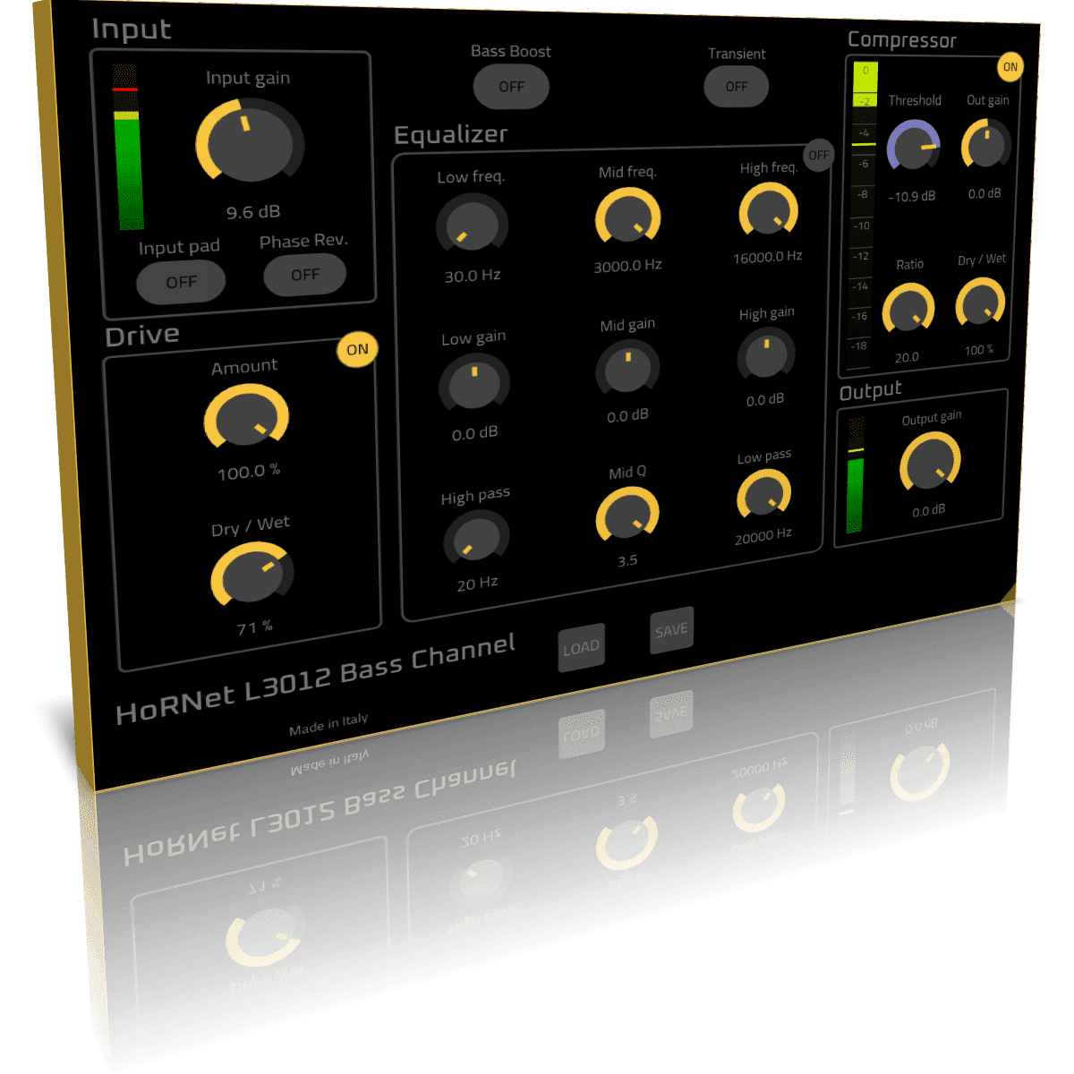 HoRNet L3012 is a channel strip plugin designed with bass players in mind and contains all the tools needed to make a bass sound good. The plugin is the result of the collaboration between HoRNet Plugins and Lusi, Italian bass player and aims to give you in a single package the tools you need for bass processing both in studio and live.