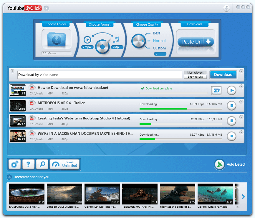 YouTube By Click is a simple, easy-to-use and powerful tool developed to simplifies possible of downloading videos and music from popular websites icluding YouTube, Facebook, Vimeo, Dailymotion, and more. It allows you to download a Video or an MP3 and you can also define the output folder and format. The program is very intuitive, fast, and very easy-to-use, requiring only one button press to get the job done. The auto-detect popup message provides you a fast and simple way to download videos and you can even download the video directly from your web browser (Chrome, Firefox, IE and Edge).
