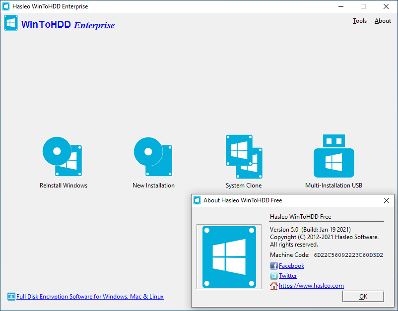 WinToHDD is an easy-to-use application that allows you to install, reinstall, and clone your currnet installed Windows without a CD / DVD or USB drive. This is an easy solution to install Windows on a device that does not have an optical drive or even when you do not have a flash drive. WinToHDD Enterprise intelligently save the Windows installer to the hard drive, using Windows Preinstallation Environment technology (WinPE) to replace MS-DOS boot disks. With it, you will be easily reinstall Windows, install windows to a different hard drive, as well as cloning current Windows installation.
