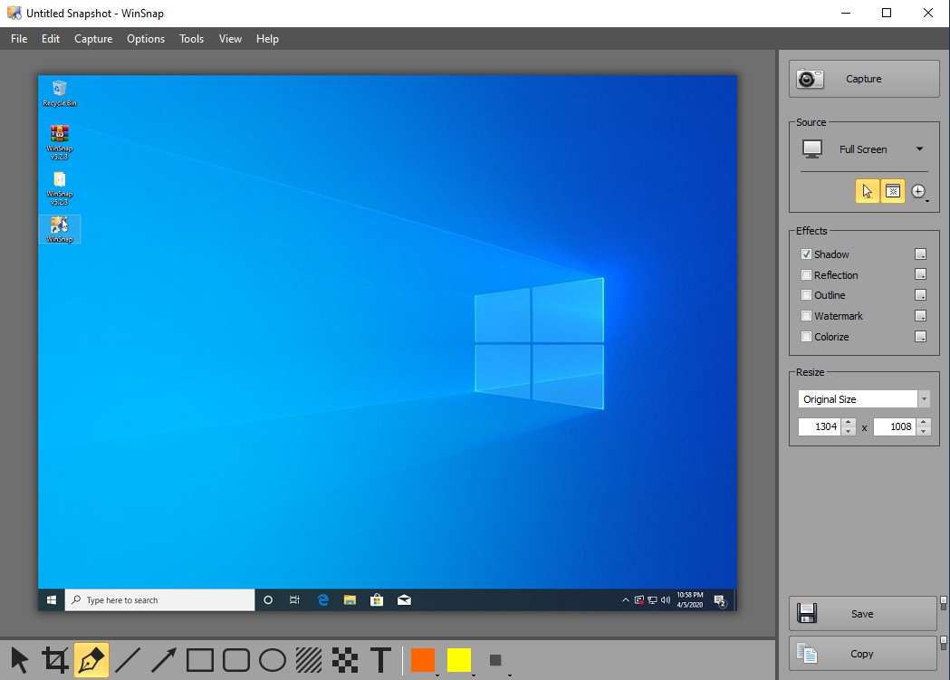 WinSnap is a small enhancement utility program for taking and editing screenshots with advanced options and flexible screen capture capabilities. It features easy-to-use hotkeys and capture options with lots of effect options inlcuding shadow, reflection, corner effect, outline, watermark, colorize, and more. WinSnap Portable allows you to customize the captured images, including changing backgrounds, coloring effects, automatic canvas transformations, and the addition of eye-candy drop shadows. It supports various image formats and has advanced auto-copy and auto-save features.