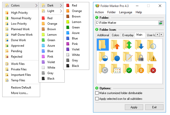 - Folder Marker Pro has two additional options for folder icon changes: "Make customized folder distributable" (portable) and "Apply selected icon to all subfolders"