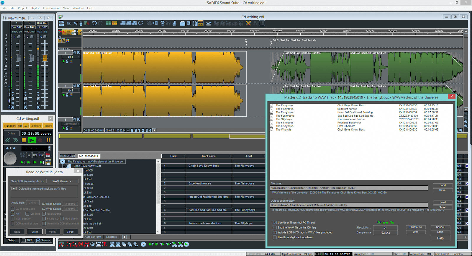 SADiE’s newly introduced WAV Master feature allows users to create WAV files for an entire album, using PQ marks to define the start and end of the WAV file for each album track. Track Titles, Artist Name and other information is automatically incorporated into these files.