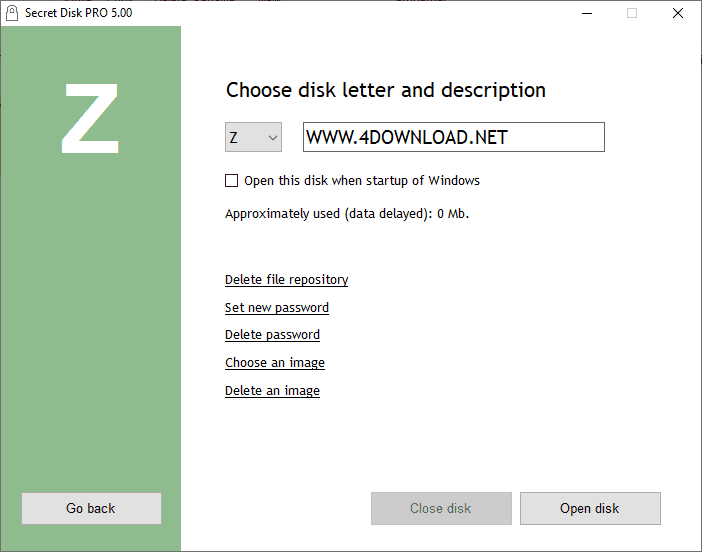 Secret Disk can create additional disk on your PC, which can be invisible and locked with a password within one second. You can make your private files and folders invisible and protected. You don't need to format your hard disk or make any changes to boot sector. Our program will create new disk automatically very quickly. You can make this disk invisible, including all contents, and protect it with a password. You can store any files and folders on the disk. Secret disk works as usual hard disk and compatible with any other programs which you have installed. You can have more than one secret disk and you can also choose disk letter.