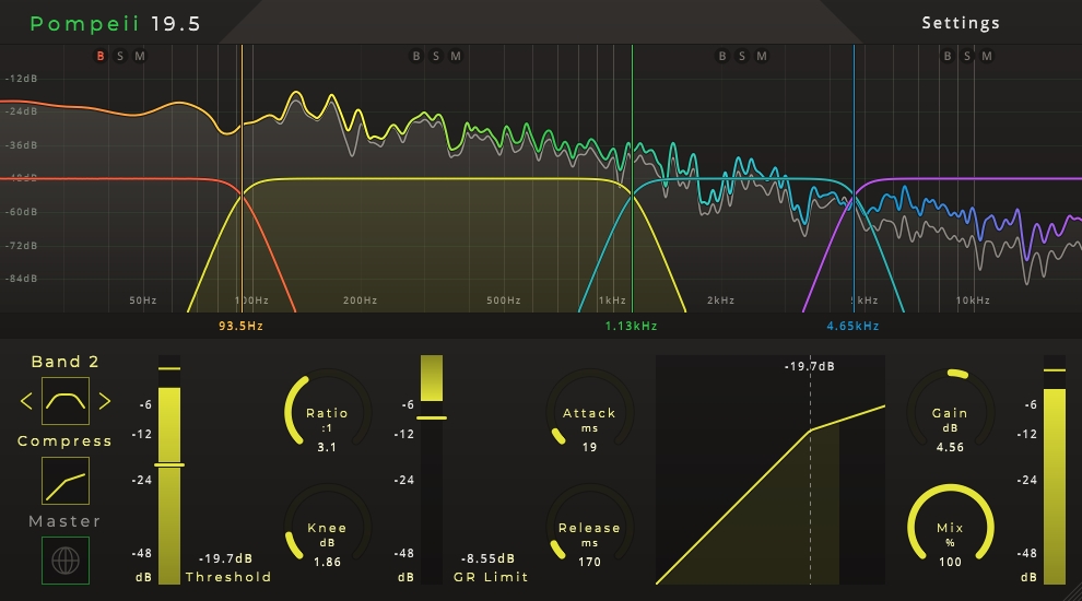 It was designed to give you ultimate control over the loudness of your sound. To achieve this, Pompeii splits your signal into four, user configurable bands and applies either compression or expansion to the band before mixing them back together. Pompeii also features a master band which is applied after the four other bands and applies to the full frequency range.