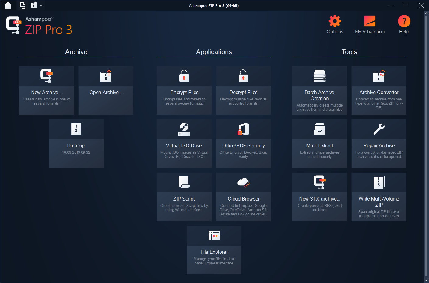 Ashampoo ZIP Pro 3 is no mere ZIP application but a complete, feature-packed suite to compress, extract, send and encrypt your files! ZIP Pro 3 handles a total of 60 archive types. Creating and encrypting archives takes just seconds, thanks to full multi-core support and 256-bit encryption keeps your archives safe. The built-in file explorer supports a classic split-pane view as well as cloud and FTP support—on top of all major ZIP functions, naturally! Enjoy 100% compatibility with ZIP, ZIPX, RAR, CAB, ISO and over 60 other popular formats! Benefit from live previews and 256-bit encrypted self-extracting archives. Upload your data via FTP and to the cloud or take the traditional route and burn them to disc!