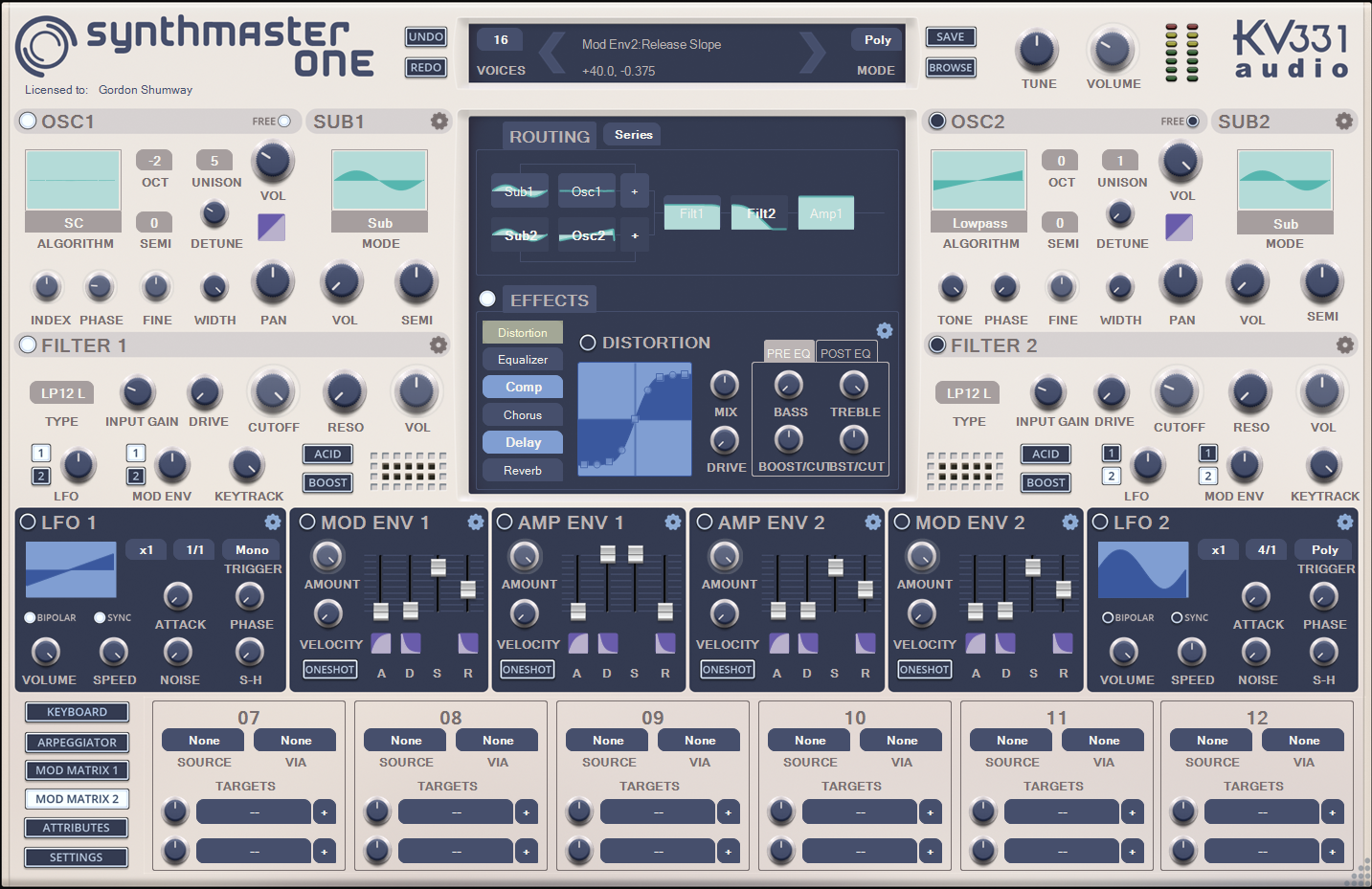 - Massive Modulation Architecture: SynthMaster has more than 650 modulation targets and 95 modulation sources including ADSR Envelopes, 2D Envelopes, Multistage Envelopes, LFOs, KeyScalers, Easy Parameters, Vocoder Bands, MIDI Velocity, Aftertouch, Pitch Bend and MIDI CC. Each modulation target can have up to 4 modulation sources. The modulation matrix, which has 64 available slots, has visual filtering as well so that targets for a specific source, or sources for a specific target can be filtered and shown on the user interface.