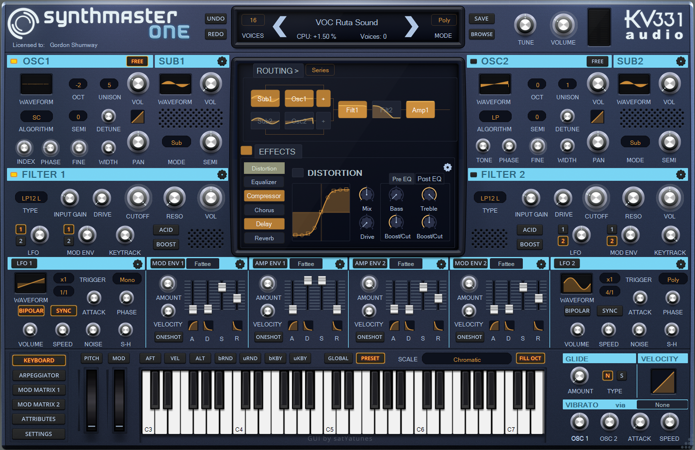 - Semi-Modular Architecture: For each SynthMaster instance, there are 2 layers followed by 2 global effect send busses. Each layer has its own: Arpeggiator, 2 Oscillators, 4 Modulators, 2 Filters, 4 ADSR Envelopes, 2 Multistage Envelopes, 2 2D Envelopes, 2 LFOs and 4 Keyscalers. The modulators can modulate frequency, phase, amplitude or pulse width of the oscillators or any other modulators at audio rate, or they can be used as regular oscillators.