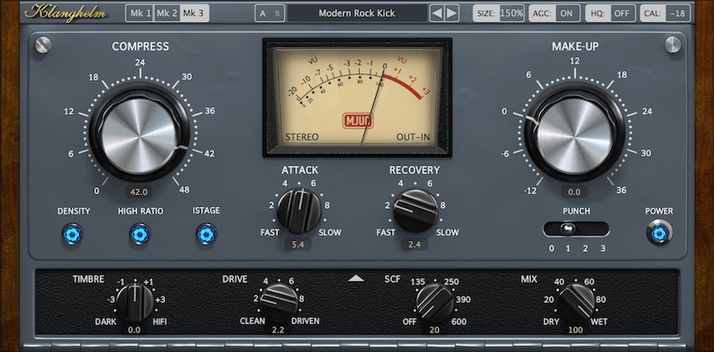 is the least colored and most Hi-Fi-sounding model in MJUC. It is Klanghelm's modern interpretation of this compression topology. The only design idea derived from another modern famous variable-mu* comp is, that it's circuitry is done entirely differential, making the unit very quiet and almost distortion-free. But the real special thing about this model is, that the actual compression is done by two different variable-mu* stages, which kind of work against each other, one works feedforward, while the other in a feedback configuration. This results in a attack accentuating, punchy compression, surprisingly closer to a British G type bus comp than to a 670.