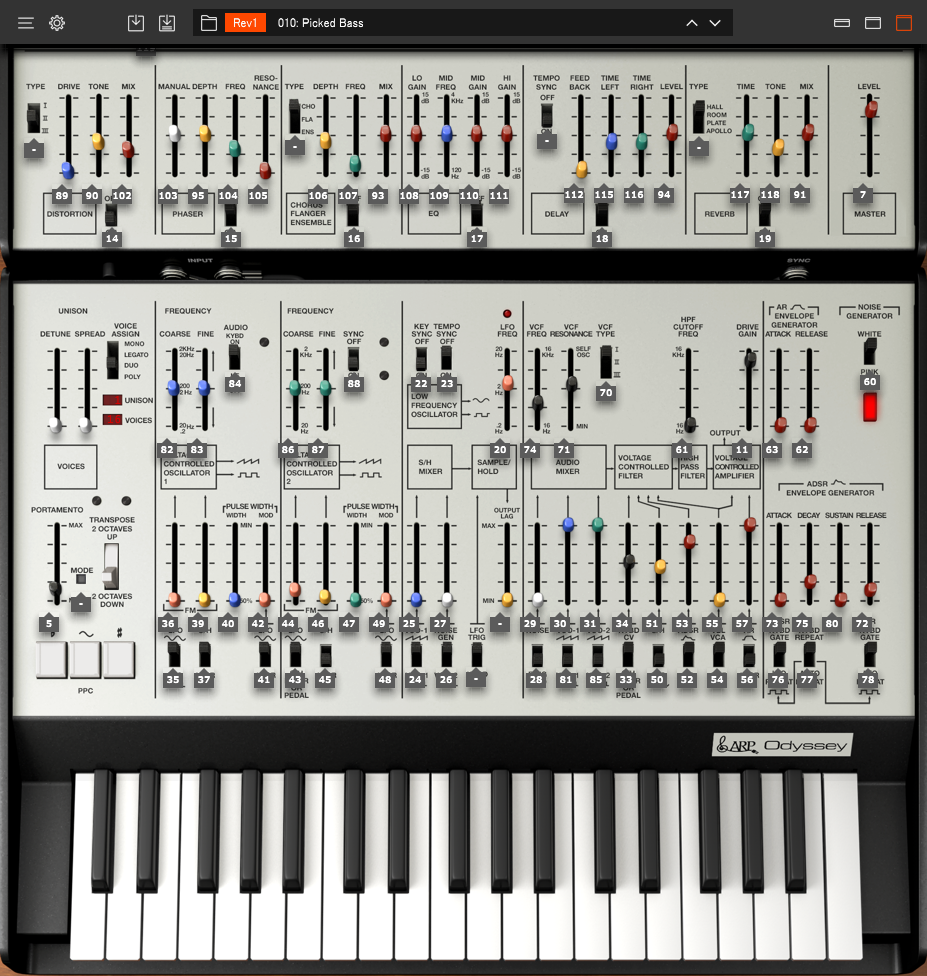 The circuitry has been reproduced using KORG's proprietary CMT (Component Modeling Technology), developed over the years for the KORG Legacy Collection. Instead of merely simulating the output sound as conventional modeling does, KORG’s CMT is a method for using digital equivalents of the transistors, capacitors, resistors, and other components used in the hardware realm to reconstruct the same signal path digitally. This perfectly reproduces the complex range of sounds and parameters that can only be created with the ARP ODYSSEY.