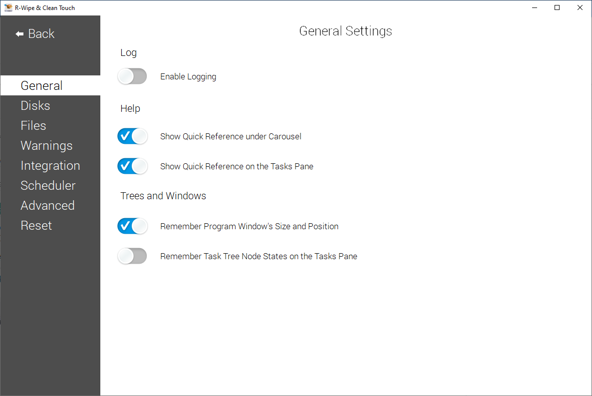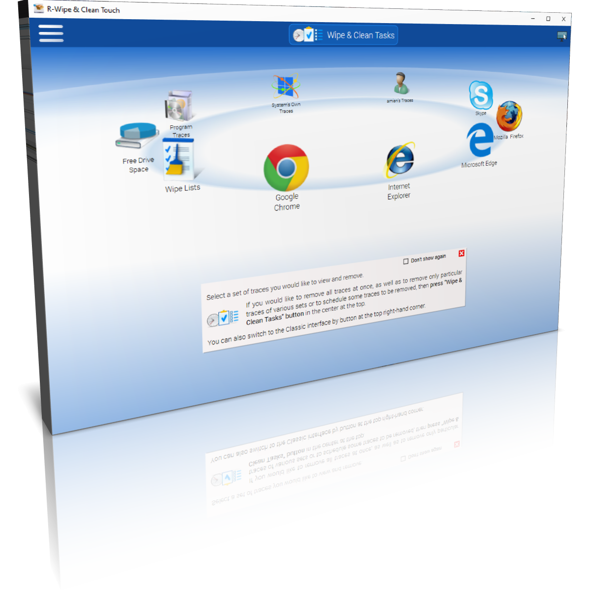 A new graphical interface designed for devices with touch screens with various resolutions: tablets, laptops with touch screens, etc.. In addition to its modern look and animation, Touch Interface is adapted to the way the users control their touch screen devices: by swiping and tapping. It provides access to all controls and settings of R-Wipe & Clean, so users with non-touch screen devices may use it too, to enjoy its original stylish appearance.