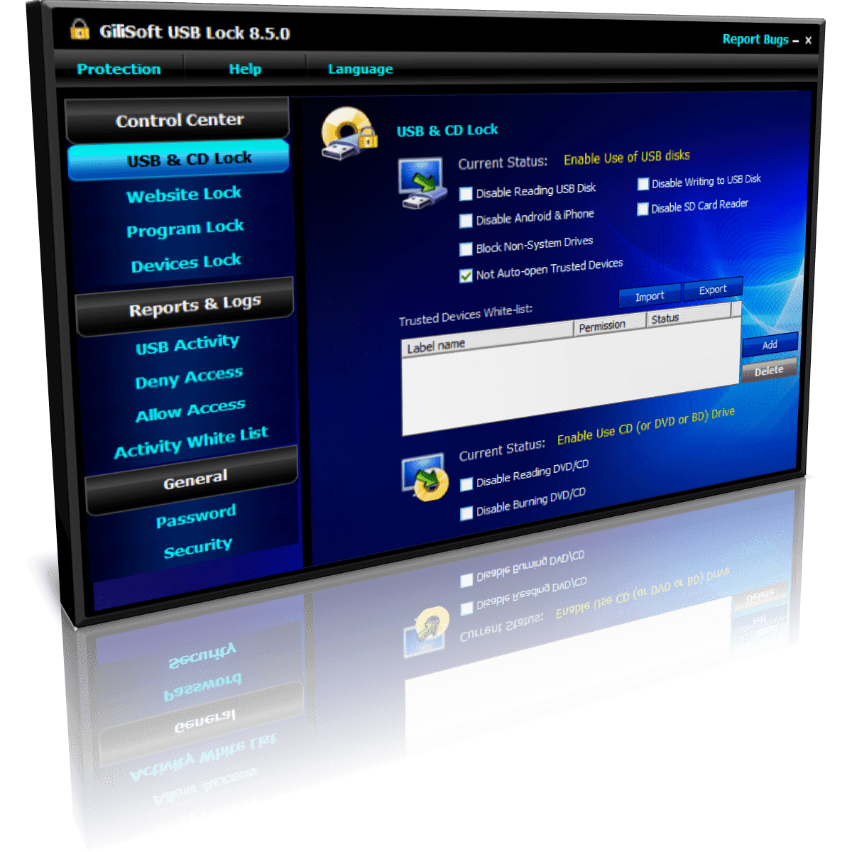 GiliSoft USB Lock is a data leak prevention tool that prevents leakage and copy of your data to USB Drives (Android phone/iPhone), External Drives, CDs/DVDs or other such portable devices. Once installed, USB Lock lets you block all such drives and devices that do not belong to you. USB Lock can stop stealing or hacking and you can share your PC with anyone without fear of data theft. This is an easy USB Secure Software and powerful Endpoint DLP Suite that helps you to lock usb port,make dvd/cd burner read-only, block some websites, forbid some programs and disable more devices. For the convenience of enterprise users to deploy, or secondary development, we also provide the command-line version, please contact us if you need.